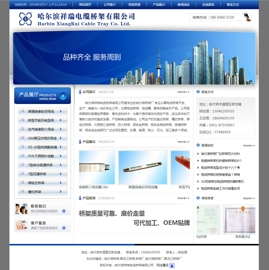 該案例完成于2014年2月,經過前期調研溝通、界面設計、功能開發(fā)與關鍵字分析優(yōu)化,總工期約10工作日,到3月間的一個月內,經過我公司SEO技術專員的不斷優(yōu)化,在哈爾濱橋架、黑龍江橋架等關鍵詞都有了很大進步,達到了百度搜索結果的首頁位置。