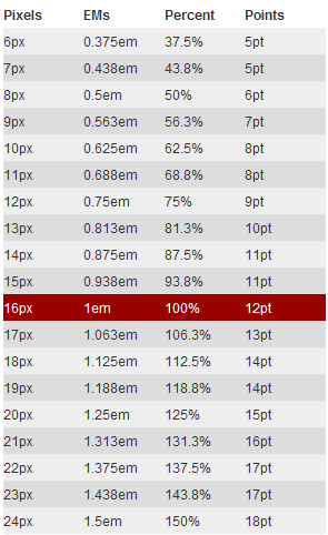 大家可以參考一下面這張轉(zhuǎn)換表(body字體為16px時(shí)的值)