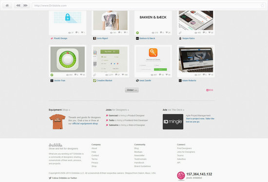 雖然上面的方法越來越流行,但很多網(wǎng)站也引入了其他方法,如Dribbble,將廣告放在網(wǎng)頁的底部和側(cè)欄處。廣告雖被安放在不起眼的位置,但它們?nèi)钥伞安东@”到普通的游客。