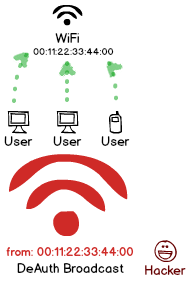 之前提到,遍歷 PPPoE 的會話ID,冒充所有用戶發(fā)出注銷請求,可以斷開全城的網(wǎng)絡(luò)。WiFi 也有類似的缺陷,只不過正好反過來:冒充熱點,向所有用戶廣播注銷包,于是所有連著該熱點的用戶都下線了。