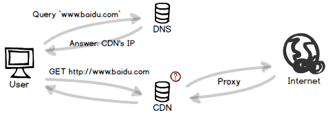 不同于黑客強制 DNS 把域名解析到自己的釣魚 IP 上,CDN 則是讓 DNS 主動配合,把域名解析到臨近的服務(wù)器上。這臺服務(wù)器同樣也開啟了 HTTP 代理,讓用戶感覺不到 CDN 的存在。