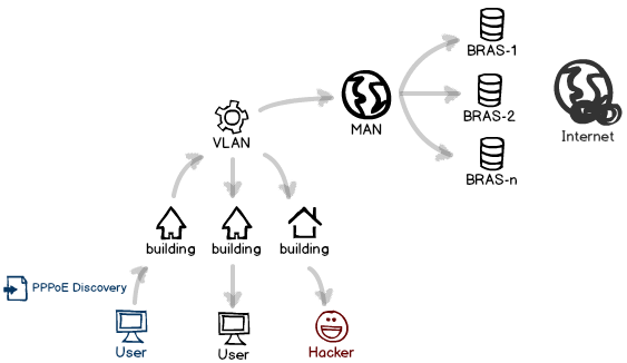 類似 DHCP 協(xié)議,PPPoE 也是通過廣播來探尋有哪些可用的終端,意味著整個小區(qū)的內(nèi)網(wǎng)用戶都能收到;同時探尋包一直往上冒泡,直到被城域網(wǎng)的終端們收到,然后開始紛紛回應。