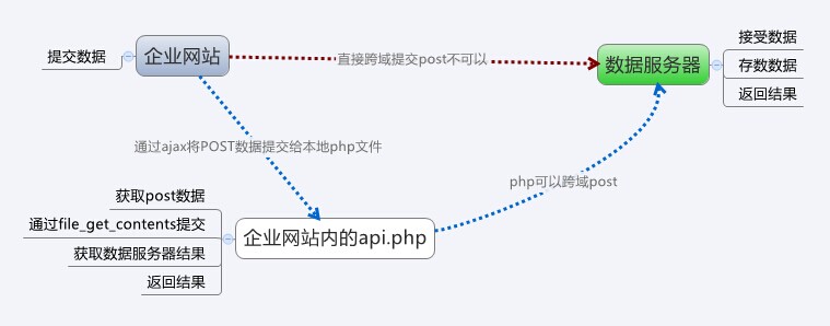 雖然javascript的跨域有限制,但php可以跨域提交post請(qǐng)求,所以在網(wǎng)站內(nèi)建立一個(gè)api,做為post的中轉(zhuǎn)站,在提交給遠(yuǎn)程服務(wù)器,這樣就可以完成跨域post請(qǐng)求。
