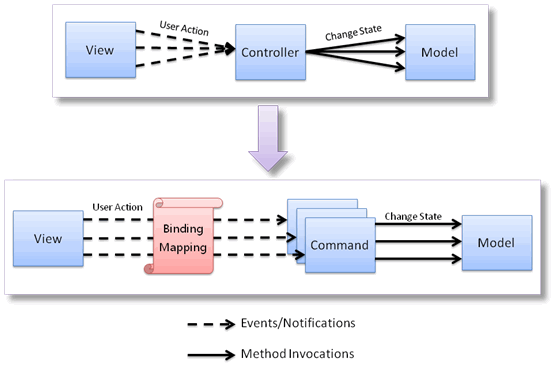 不管是基于controller還是基于command,MVC架構(gòu)中界定的“協(xié)調(diào)view與model交互”的控制器職責是不會變的,都需要相應(yīng)的組件和機制去承載與實現(xiàn)。在基于command的架構(gòu)里,command承擔了過去controller的部分職責,從某種意義上說command是一種細粒度的controller,但是command的特性是偏“被動”的。一方面,它對于view和model的控制力比controller弱化了很多, 比如,一般情況下command是不會直接操縱view的。另一方面,它不知道自己與什么樣的user action映射在了一起,也不知道自己會在何種情況下被觸發(fā)執(zhí)行。支撐command的運行需要額外的注冊、綁定和觸發(fā)機制,是這些機制加上command一起實現(xiàn)了controller的職責。由于現(xiàn)在多數(shù)基于command的MVC框架都實現(xiàn)并封裝了這些重要的機制,所以從某種意義上說,是這些框架自身扮演了controller角色。