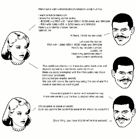 假定客戶端叫做愛麗絲,服務(wù)器叫做鮑勃,整個握手過程可以用下圖說明(點(diǎn)擊看大圖)。