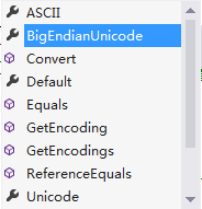 我在上一篇文章《你不知道的 頁(yè)面編碼,瀏覽器選擇編碼,get,post各種亂碼由來》中說過:“如何查看中文字符的十六進(jìn)制字符串?方法:BitConverter.ToString(System.Text.Encoding.UTF8.GetBytes(“阿道夫”));” 請(qǐng)注意我可以改為“System.Text.Encoding.Unicode.GetBytes” 如下圖是vs2013 Encoding鍵入“.”后的智能提示