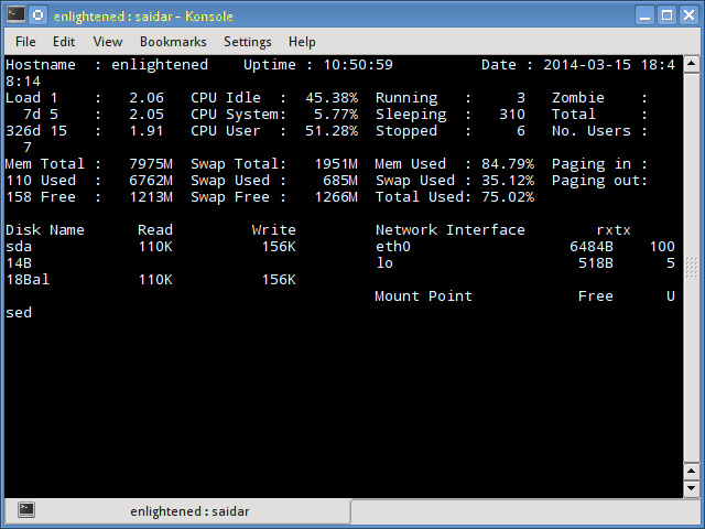 Saidar是所有命令行工具中最簡單的,它的輸出包括CPU、進程、負載、內存、交換、網絡I/O、磁盤I/O和文件系統(tǒng)信息的統(tǒng)計。它的輸出不包括現(xiàn)在運行中的進程。