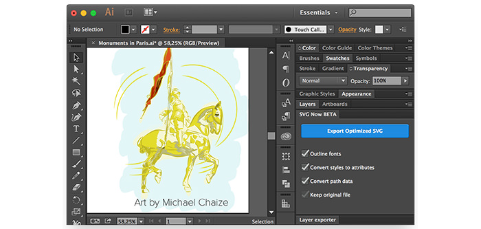 當(dāng)你工作在 Illustrator 上時(shí),輸出的 SVG 包含許多并不需要的信息。使用這個(gè)工具你可以從你的 Illustrator 右邊得到優(yōu)化版本的導(dǎo)出 SVG 。這個(gè)工具在面板上添加了一些優(yōu)化 SVG 選項(xiàng)。你可以從Creative Cloud Add-ons page 取得 SVG Now。