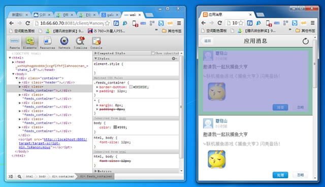 在需要調(diào)試的頁面加入中以下腳本:<script type=”text/javascript” src=”http://localhost:8081/target/target-script-min.js#anonymous”></script>,注意把localhost換成手機能夠訪問的真實IP地址。當手機訪問這個頁面時,weinre客戶端就會檢測到目標設(shè)備,然后就可以對它進行調(diào)試了。