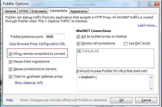 PC上開啟fiddler,并在設(shè)置中勾選“allow remote computers to connect”