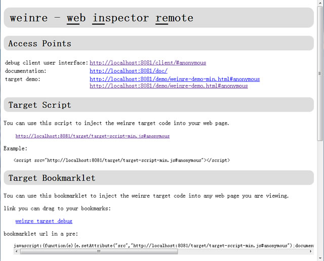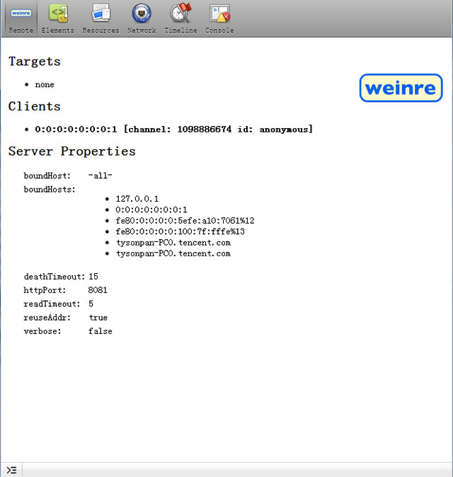 訪問localhost:8081,如果看到如下的頁面,說明weinre已經(jīng)啟動成功: