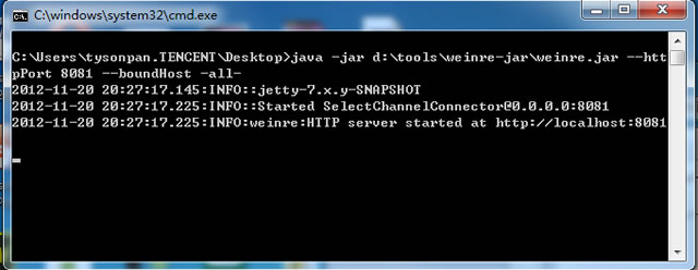 java -jar d:toolsweinre-jarweinre.jar –httpPort 8081 –boundHost -all- //(httpPort是指定服務(wù)端口,boundHost參數(shù)說明可以使用IP訪問,all參數(shù)代表支持所有的host)。 |
