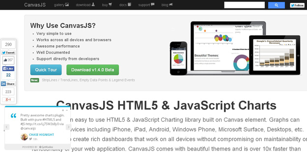 CanvasJS 是個(gè)易用的 HTML 5 & JavaScript 圖表庫(kù),基于 Canvas 元素。Graphs 可以通過設(shè)備渲染,包括 iPhone,iPad,Android,Windows Phone,Microsoft Surface,Desktops 等等。它允許用戶創(chuàng)建適用于所有設(shè)備,不影響 web 應(yīng)用程序的功能和可維護(hù)性的富儀表盤。CanvcasJS 有著非常漂亮的主題和超過傳統(tǒng)的 Flash 和 SVG 圖表 10x 倍以上的速度——生成輕量級(jí),漂亮和響應(yīng)式的儀表圖。