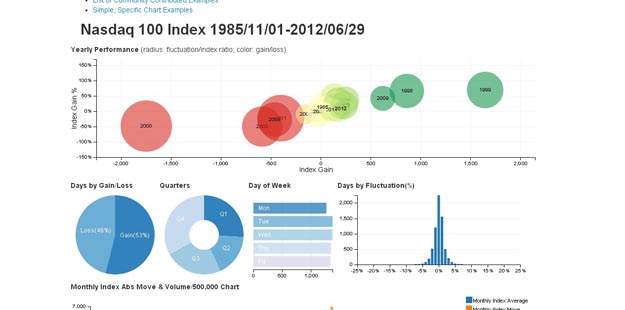 canvasXpress 是一個(gè)基于HTML5 canvas標(biāo)簽實(shí)現(xiàn)的JavaScript圖表類庫(kù),它能夠支持線性圖、柱形圖、餅圖和熱點(diǎn)圖等多種常見的圖表類型。它所生成的圖表交互性很強(qiáng),鼠標(biāo)放 上去時(shí)會(huì)動(dòng)態(tài)顯示值。除此之外,它也具有相當(dāng)高的可定制性,可設(shè)置圖表的文字、顏色和要顯示/隱藏的元素等。當(dāng)然更重要的一點(diǎn)是,雖然它使用了 HTML5,但是依然支持IE6瀏覽器。