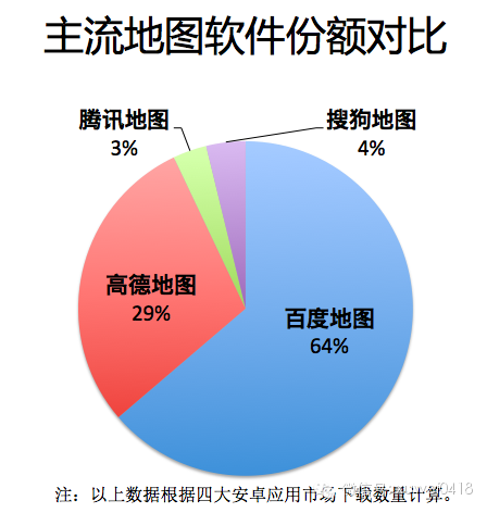 通過(guò)統(tǒng)計(jì)百度手機(jī)助手、360手機(jī)助手、豌豆莢和應(yīng)用寶4家最主流的安卓應(yīng)用商店當(dāng)中地圖軟件的下載數(shù)量,我們可以粗略的看出這個(gè)市場(chǎng)的格局:百度地圖占到6成的市場(chǎng)份額遙遙領(lǐng)先,高德地圖占3成市場(chǎng)份額穩(wěn)居第二,騰訊地圖、搜狗地圖等其他地圖軟件總共占據(jù)剩余的1成份額,對(duì)前兩名基本上形成不了威脅。