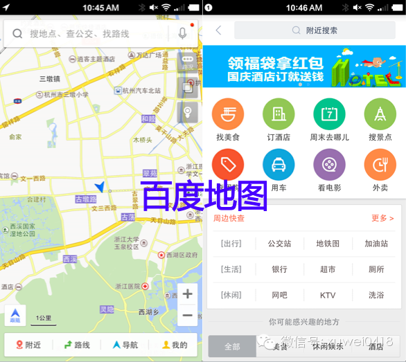 也許有些愛思考的讀者會(huì)說(shuō):“不一定啊,我用團(tuán)購(gòu)軟件去找店的。”那么請(qǐng)大家對(duì)照一下下面兩張圖:第一張左邊是百度地圖首頁(yè),右邊是點(diǎn)擊“附近”進(jìn)入的商戶類目頁(yè)面;第二張左邊是美團(tuán)網(wǎng)的首頁(yè),右邊是點(diǎn)擊“地圖”進(jìn)入的地圖頁(yè)面。怎么樣,是不是感覺(jué)二者只是換了一下順序而已?