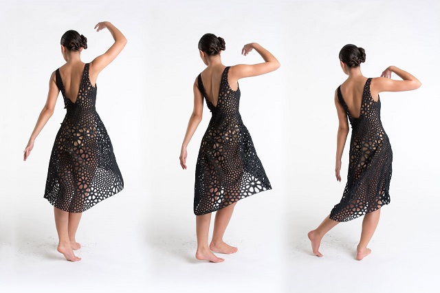 在定制化生產(chǎn)之后,服裝生產(chǎn)的下一步可能就會(huì)進(jìn)入 3D 打印時(shí)代,該技術(shù)允許你按照自己的設(shè)計(jì)一次只打印一件成品。人們將進(jìn)入「實(shí)時(shí)消費(fèi)」階段:你可以每天為自己打印不同的鞋子與耳環(huán)。如今花不到 100 美元你就可以獲得 3D 打印的定制珠寶,3D 打印的鞋子也為之不遠(yuǎn)了。Nervous System 設(shè)計(jì)工作室甚至能夠?yàn)橛脩籼峁┟麨?Kinematics 的 3D 打印晚禮服。這款 3D 打印晚禮服所使用的服裝材料為數(shù)千個(gè)相互連接的硬體塑料環(huán)。3D 打印服飾通常需要在打印之后另行組裝,因?yàn)樗鼈凅w積太大無(wú)法一次性打印完畢。Kinematics 的制作過(guò)程也是如此,你需要將其打印成一整張,然后經(jīng)過(guò)折疊成為最終成品。3D 打印的晚禮服一件就需要約 4000 美元,因此距今為止只賣出了不到 12 件(其中還有一件去年被紐約現(xiàn)代藝術(shù)博物館購(gòu)買作為藏品)。