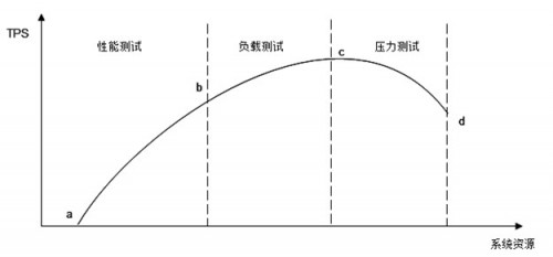 圖4.3中的橫坐標表示消耗的系統(tǒng)資源,縱坐標表示系統(tǒng)處理能力(吞吐量)。在開始階段,隨著并發(fā)請求數(shù)目的增加,系統(tǒng)使用較少的資源就達到較好的處理能力(a~b段),這一段是網(wǎng)站的日常運行區(qū)間,網(wǎng)站的絕大部分訪問負載壓力都集中在這一段區(qū)間,被稱作性能測試,測試目標是評估系統(tǒng)性能是否符合需求及設(shè)計目標;隨著壓力的持續(xù)增加,系統(tǒng)處理能力增加變緩,直到達到一個最大值(c點),這是系統(tǒng)的最大負載點,這一段被稱作負載測試。測試目標是評估當系統(tǒng)因為突發(fā)事件超出日常訪問壓力的情況下,保證系統(tǒng)正常運行情況下能夠承受的最大訪問負載壓力;超過這個點后,再增加壓力,系統(tǒng)的處理能力反而下降,而資源消耗卻更多,直到資源消耗達到極限(d點),這個點可以看作是系統(tǒng)的崩潰點,超過這個點繼續(xù)加大并發(fā)請求數(shù)目,系統(tǒng)不能再處理任何請求,這一段被稱作壓力測試,測試目標是評估可能導致系統(tǒng)崩潰的最大訪問負載壓力。