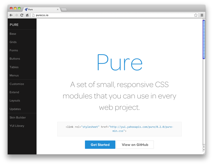 Pure CSS 來(lái)自雅虎,是一組 CSS 模塊,您可以作為基礎(chǔ)在每一個(gè) Web 項(xiàng)目中使用。它使 CSS 開發(fā)更容易,整個(gè)框架看起來(lái)很干凈,專業(yè)。如果你還沒(méi)有用過(guò)的話,嘗試一下!更多信息: http://purecss.io/