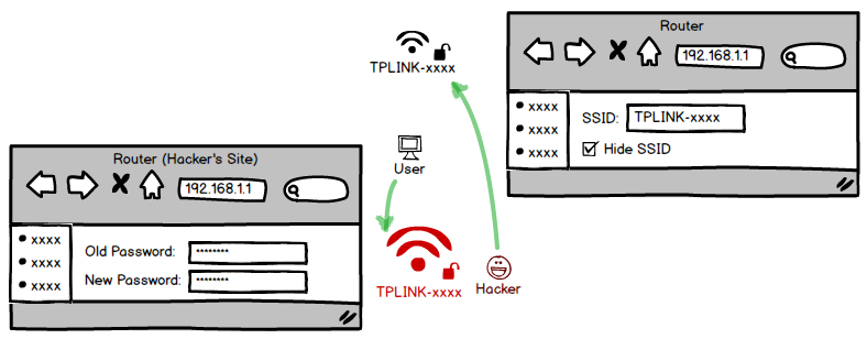當然,為了防止他之后進入路由器改密碼,你必須立即隱藏 SSID,讓 Beacon 不再發(fā)出,這樣大家都看不見這臺設(shè)備了,只能通過 BSSID(路由器 MAC 地址)來連接。但是人家會有疑問,剛恢復好的路由器怎么看不見?這時得事先建立一個釣魚熱點,名字和那被隱藏的 SSID 一樣,將對方引誘到自己的蜜罐上。