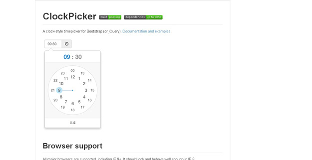 一個(gè)時(shí)鐘分割的時(shí)間拾取器的Boostrap的jQuery插件。同時(shí)支持桌面和移動(dòng)設(shè)備。也可以很好運(yùn)行在觸屏設(shè)備上。大部分瀏覽器都支持,包括IE9+。但是它應(yīng)該在IE8上看起來和表現(xiàn)得足夠好。