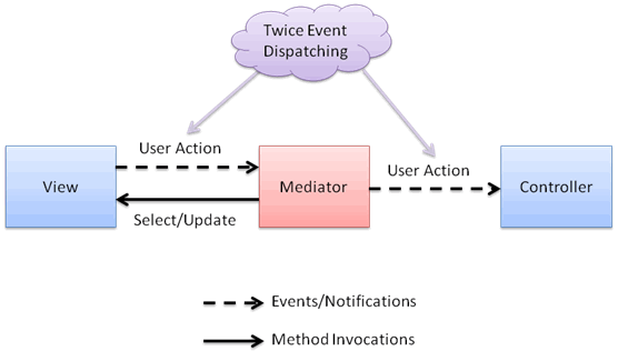 筆者早年開發(fā)基于swing的GUI應(yīng)用時,在架構(gòu)MVC的實踐過程中深刻體會到了view與controller之間的緊密耦合問題。在很多事件驅(qū)動的GUI框架里,如swing,用戶對view的任何操作都會觸發(fā)一個事件,然后在listener的響應(yīng)方法里進行處理。如果讓view自己注冊成為事件的listener,則必須要在view中加入對controller的引用,這不是MVC希望看到的,因為這樣view和controller就形成了緊密的耦合關(guān)系。若將controller注冊為listener,則事件響應(yīng)將由controller承擔,這又會導致controller處理其不該涉及的展現(xiàn)邏輯,造成view和controller難以解耦的原因在于:多數(shù)的用戶請求都包含一定成分的展現(xiàn)邏輯和一定成分的業(yè)務(wù)邏輯,兩種邏輯揉合在一個請求里,在處理的時候,view與controller很難合理地分工。解決這一問題的關(guān)鍵是要在view與controller之間建立一種可以將展現(xiàn)邏輯與業(yè)務(wù)邏輯進行有效分割的機制,在這方面,PureMVC的設(shè)計非常值得參考,它通過引入mediator+二次事件委派機制很好的解決了view與controller之間的緊耦合問題。