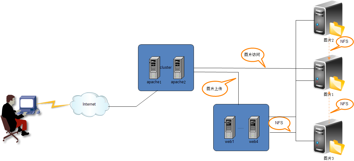 用戶通過Internet訪問頁面提交上傳請求post到web服務器,web服務器處理完圖片后由web服務器拷貝到對應的mount本地目錄。
