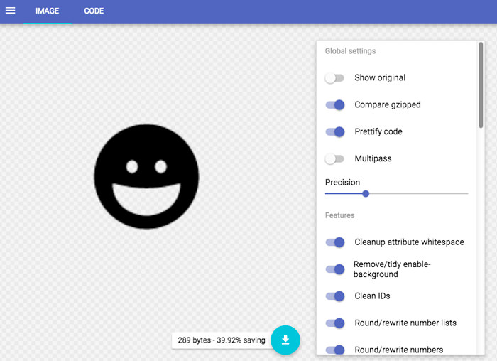 SVG OMG 將 SVGO 的命令行包裝成了一個(gè)帶 GUI 的版本,你可以簡(jiǎn)單的通過(guò)點(diǎn)點(diǎn)按鈕來(lái)打開和關(guān)閉特性,最后你導(dǎo)出一下圖片或者代碼就行了。