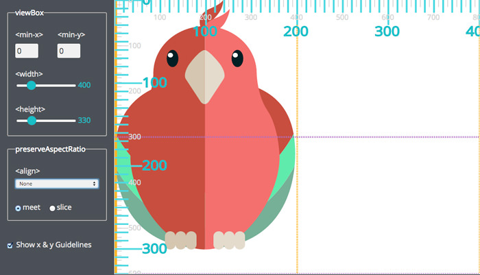 設(shè)計(jì) SVG,離不開它的坐標(biāo)系統(tǒng)。這是一個(gè)由 Sara Souiden 編寫的超贊的交互工具,可以幫助你理解 SVG 坐標(biāo)系統(tǒng)是怎么一回事。 使用 SVG 的 viewBox 和 preserveAspectRatio,也就是下圖所示的粉色線和橙色線,以及旁邊的標(biāo)尺,你可以在折騰的過(guò)程中學(xué)習(xí)到 SVG 坐標(biāo)是如何工作的。