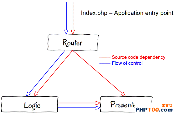 控制流與源代碼的依賴關(guān)系都通過Router、然后是Logic、最后通過表示層。最后一步變更削弱了我們?cè)谥安襟E中所觀察到的依賴倒置特性,但大家千萬不要因此受到迷惑——原理依然如故,我們要做的是使其更加清晰。