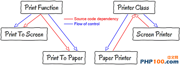 在上面的圖片中,我們描繪了一個(gè)簡(jiǎn)單的例子:多態(tài)性如何在兩個(gè)不同范式之間發(fā)揮作用。在程序化或者結(jié)構(gòu)化編程領(lǐng)域,控制流與源代碼在依賴關(guān)系上非常相似——二者都指向更具體的輸出行為。