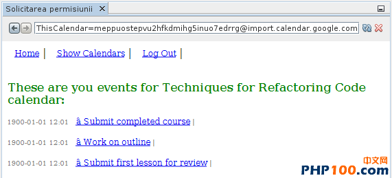 現(xiàn)在工作徹底完成了。當(dāng)然,我們的設(shè)計(jì)肯定還有很多改進(jìn)的空間。我們可以為L(zhǎng)ogic類中的方法編寫一些測(cè)試流程,也許Logic類本身也可以換個(gè)更有代表性的名稱,例如GoogleCalendarGateway。我們還可以創(chuàng)建Event與Calendar類,從而更好地控制相關(guān)數(shù)據(jù)及行為,同時(shí)將Presenter的依賴關(guān)系根據(jù)數(shù)據(jù)類型拆分為數(shù)組。另一項(xiàng)改進(jìn)與擴(kuò)展方針則是創(chuàng)建多態(tài)性行為類,用于取代直接通過$_GET調(diào)用函數(shù)??偠灾瑢?duì)于這一范例的改進(jìn)可謂無窮無盡,有興趣的朋友可以嘗試將自己的想法轉(zhuǎn)化為現(xiàn)實(shí)。我在附件的GoogleCalObjectOrientedFinal文件夾中保存有代碼的最終版本,大家能夠以此為起點(diǎn)進(jìn)行探索。