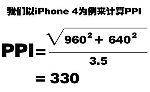 PPI,有時也叫DPI,所表示的是每英寸所擁有的像素(pixel)數(shù)目,數(shù)值越高,即代表顯示屏能夠以越高的密度顯示圖像。(注:這里的像素,指的是device pixels。)搞清楚了PPI是什么意思,我們就能很容易理解PPI的計算方式了,我們需要首先算出手機屏幕的對角線等效像素,然后處以對角線(我們平常所說的手機屏幕尺寸就是說的手機屏幕對角線的長度),就可以得到PPI了。準確的計算公示大家可以參照下圖。比較有意思的是,根據(jù)公式計算出來的iPhone 4的PPI為330,要比蘋果官方公布的326要高一點點。