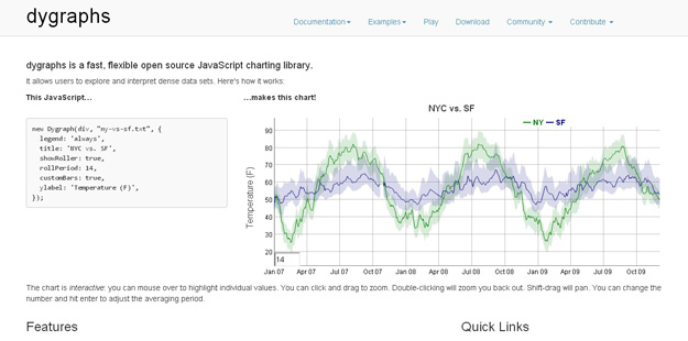 Dygraphs 是個(gè)快速,靈活,開源的 JavaScript 圖表庫(kù)。它允許用戶展示和解析密集的數(shù)據(jù)集??梢愿吡列枰獜?qiáng)調(diào)的數(shù)據(jù)集。可以使用鼠標(biāo)點(diǎn)擊或者用鼠標(biāo)拖動(dòng)來縮放圖表;可以修改數(shù)值或者點(diǎn)擊條目來調(diào)整平均周期。