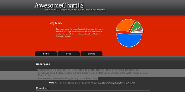 AwesomeChartJS Awesome Chart JS 是一個(gè)Javascript生成圖表的類庫(kù),它利用了 HTML5 的 canvas 標(biāo)簽來創(chuàng)建統(tǒng)計(jì)圖表。此類庫(kù)就是為了減輕開發(fā)者的工作量,使用它只需書寫幾行代碼便能生成漂亮的圖表。