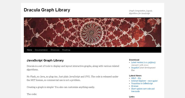Dracula 是用一系列的工具來顯示和布局互動(dòng)圖表,包括各種相關(guān)的算法。它只是純 JavaScript 和 SVG ,并無 Flash,Java,其他插件。它非常容易使用,用戶可以很簡(jiǎn)單的自定義任意的元素。