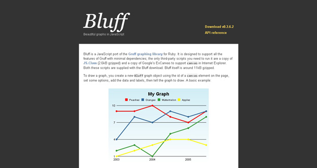 Bluff 是個(gè) JavaScript 的 Ruby 的 Gruff graphing library 端口。它支持所有 Gruff 的特性,但是有著最小的依賴。用戶只需要運(yùn)行一個(gè)第三方腳本: JS.Class 副本(壓縮后只有 2.6kB ) 和 Google 的 ExCanvas 副本,用來支持 IE 中的 canvas。這兩個(gè)腳本在 Bluff 中都有下載。Bluff 自身壓縮后大小大概有 11KB 。