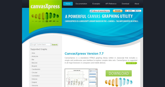 canvasXpress 是一個(gè)基于HTML5 canvas標(biāo)簽實(shí)現(xiàn)的JavaScript圖表類庫(kù),它能夠支持線性圖、柱形圖、餅圖和熱點(diǎn)圖等多種常見的圖表類型。它所生成的圖表交互性很強(qiáng),鼠標(biāo)放 上去時(shí)會(huì)動(dòng)態(tài)顯示值。除此之外,它也具有相當(dāng)高的可定制性,可設(shè)置圖表的文字、顏色和要顯示/隱藏的元素等。當(dāng)然更重要的一點(diǎn)是,雖然它使用了 HTML5,但是依然支持IE6瀏覽器。