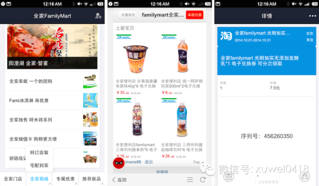 第一個(gè)例子是支付寶的全家便利店服務(wù)窗(服務(wù)窗其實(shí)和微信服務(wù)號(hào)非常類似,換了個(gè)名字而已),它有一個(gè)“全家商城”類目,點(diǎn)進(jìn)去有“網(wǎng)訂店取”、“宅配到家”兩個(gè)選項(xiàng),我點(diǎn)擊“網(wǎng)訂店取”以后進(jìn)入了一個(gè)天貓商城店鋪,成功購(gòu)買某項(xiàng)商品后,我得到了一個(gè)電子券,這是一串?dāng)?shù)字代碼,我可以到店鋪去把東西換走。